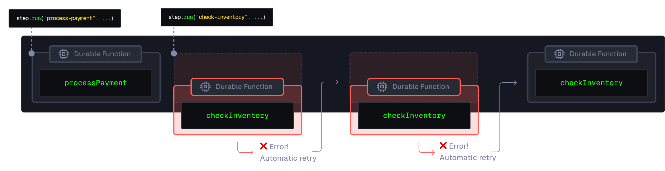 Inngest Functions are composed of steps defined using the step.run() API. Each step is an independent cached and retriable part of your function, making your workflows durable (in other words, unbreakable).